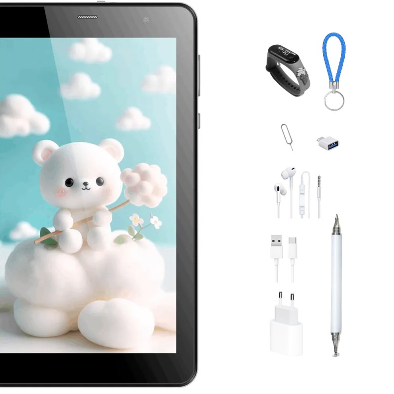 Incluye: Auricular - Adaptador OTG - Lápiz óptico - Capa protectora - Pelicula para tablet - Llavero - Cargador USB - Adaptador de cable - Reloj inteligente